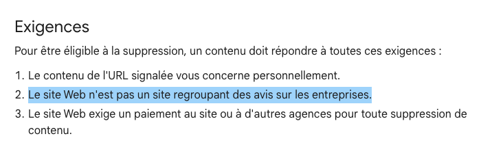 Google précise explicitement qu’il ne donnera pas suite aux demandes de désindexation des contenus publiés sur les sites d’avis clients :
