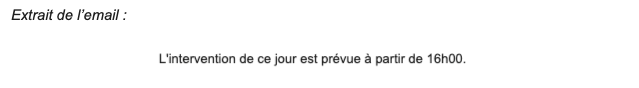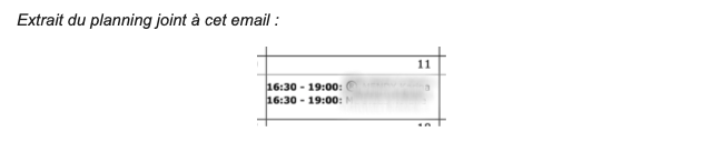 Entre-temps la responsable RH m’adresse un email où elle se contredit elle-même indiquant une intervention à 16h tout en joignant un planning où il est précisé …. 16h30.